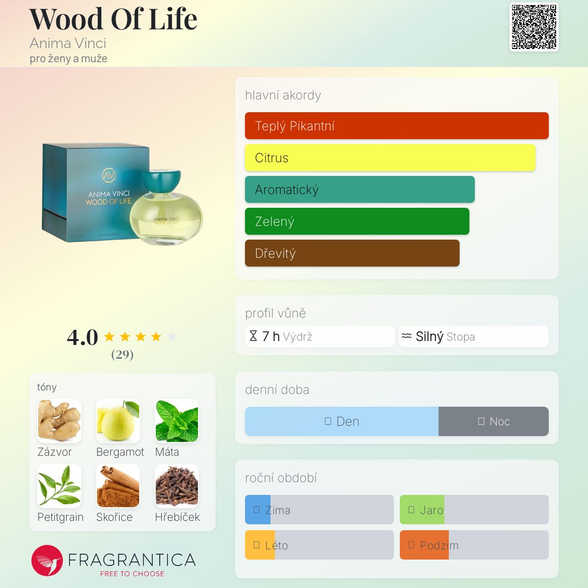 Wood Of Life podle Anima Vinci je Woody Spicy vůně pro ženy a muže. Wood Of Life byl/a uveden/a v roce 2017. "Nosem" za touto vůní je Michel Roudnitska. Vrchní tóny jsou Zázvor, Bergamot, Máta, Grapefruit a Mandarinka; střední tóny jsouPetitgrain, Skořice, Hřebíček, Hedione, Růže a Ylang-Ylang ; základní tóny jsou Santalové dřevo, Pižmo, Vetiver, Pačuli, Kůže a Vanilka.