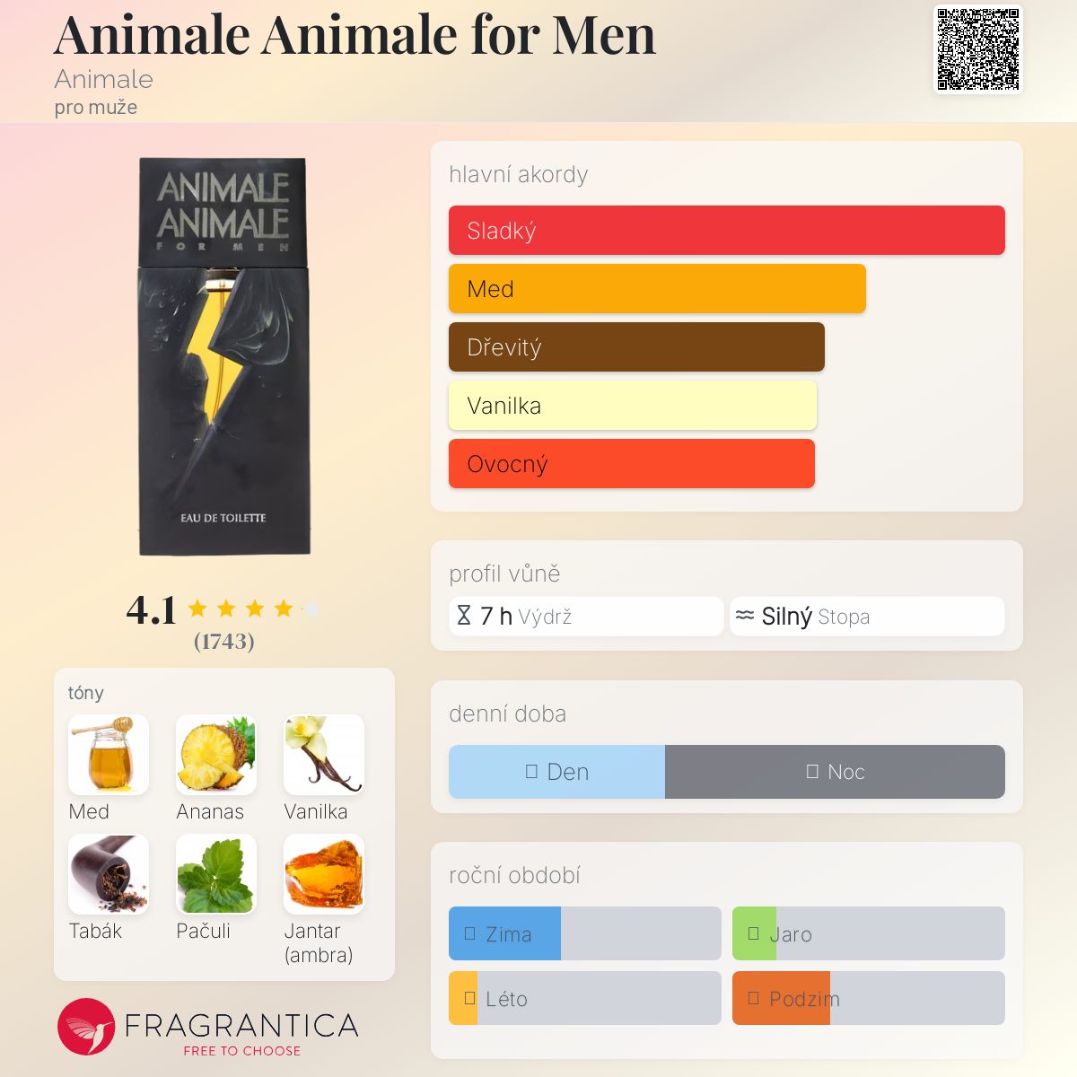 Animale Animale for Men podle Animale je Orientální Woody vůně pro muže. Animale Animale for Men byl/a uveden/a v roce 1994. Vrchní tóny jsou Ananas, Levandule, Limetka, Galbanum, Citrón a Konvalinka; střední tóny jsouMed, Muškátový oříšek, Ylang-Ylang, Růže a Jasmín ; základní tóny jsou Vanilka, Tabák, Pačuli, Jantar (ambra), Santalové dřevo, Pižmo a Cedr.