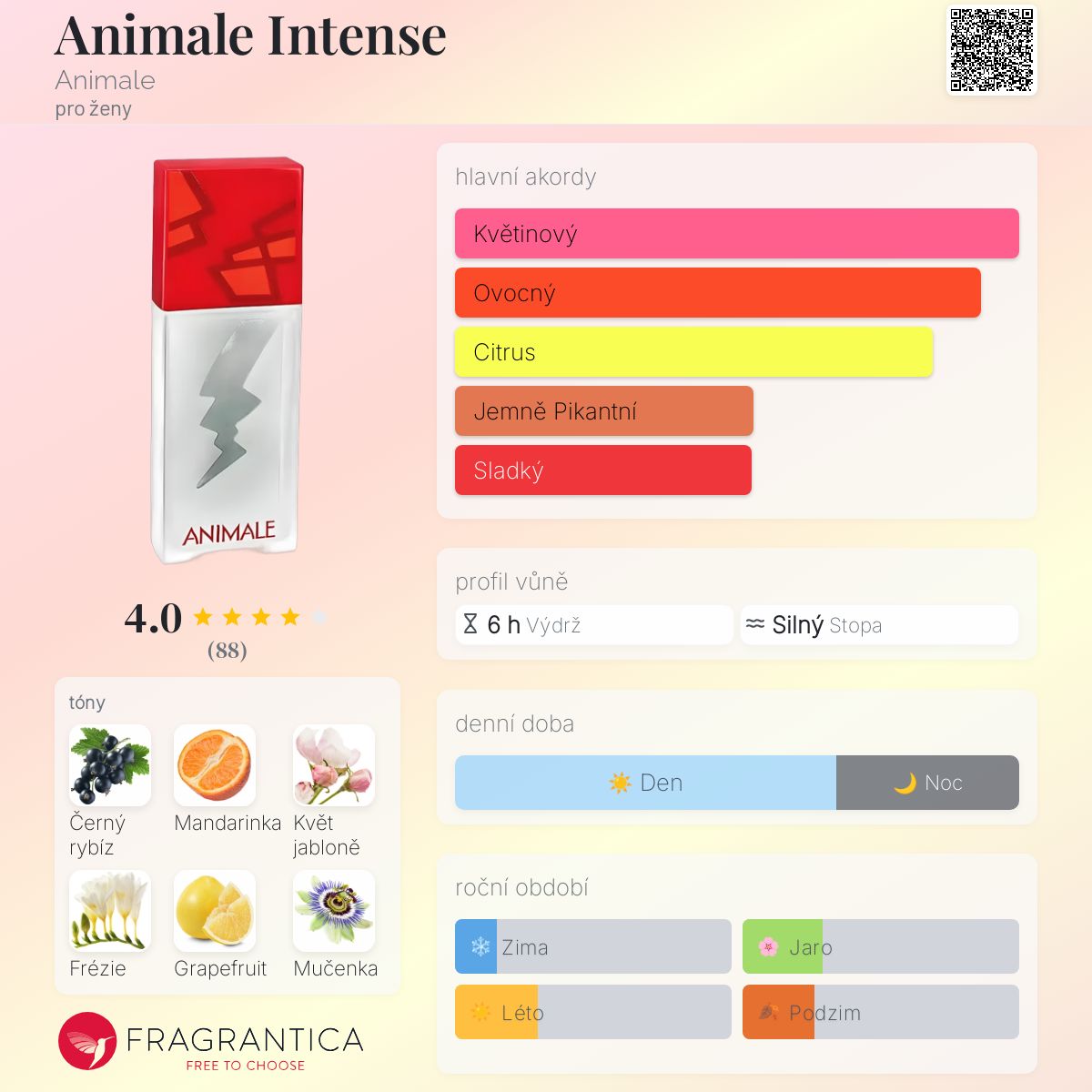 Animale Intense podle Animale je Floral vůně pro ženy. Animale Intense byl/a uveden/a v roce 2013. Vrchní tóny jsou Mandarinka a Grapefruit; střední tóny jsouFrézie a Mučenka ; základní tóny jsou Černý rybíz a Květ jabloně.