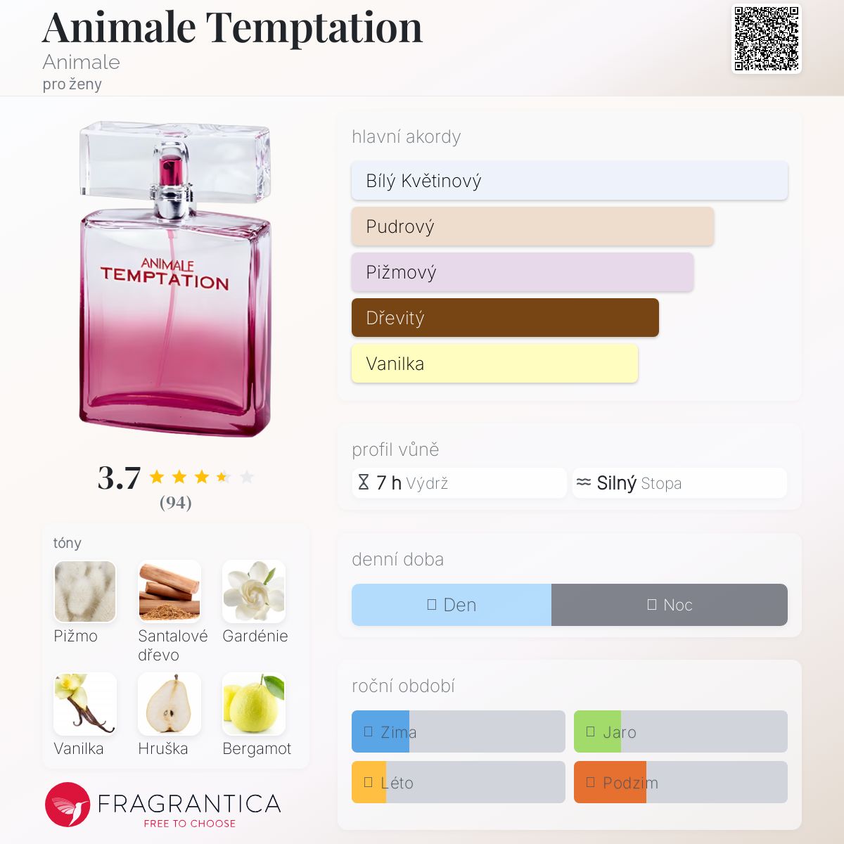 Animale Temptation podle Animale je Floral Fruity vůně pro ženy. Animale Temptation byl/a uveden/a v roce 2006. Vrchní tóny jsou Hruška a Bergamot; střední tóny jsouGardénie, Jasmín a Konvalinka ; základní tóny jsou Pižmo, Santalové dřevo a Vanilka.