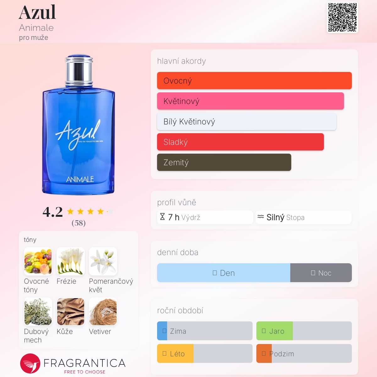 Azul podle Animale je Woody Aromatic vůně pro muže. Azul byl/a uveden/a v roce 2005. Vrchní tón je Ovocné tóny ; střední tóny jsouFrézie a Květ afrického pomeranče ; základní tóny jsou Dubový mech, Kůže a Vetiver.