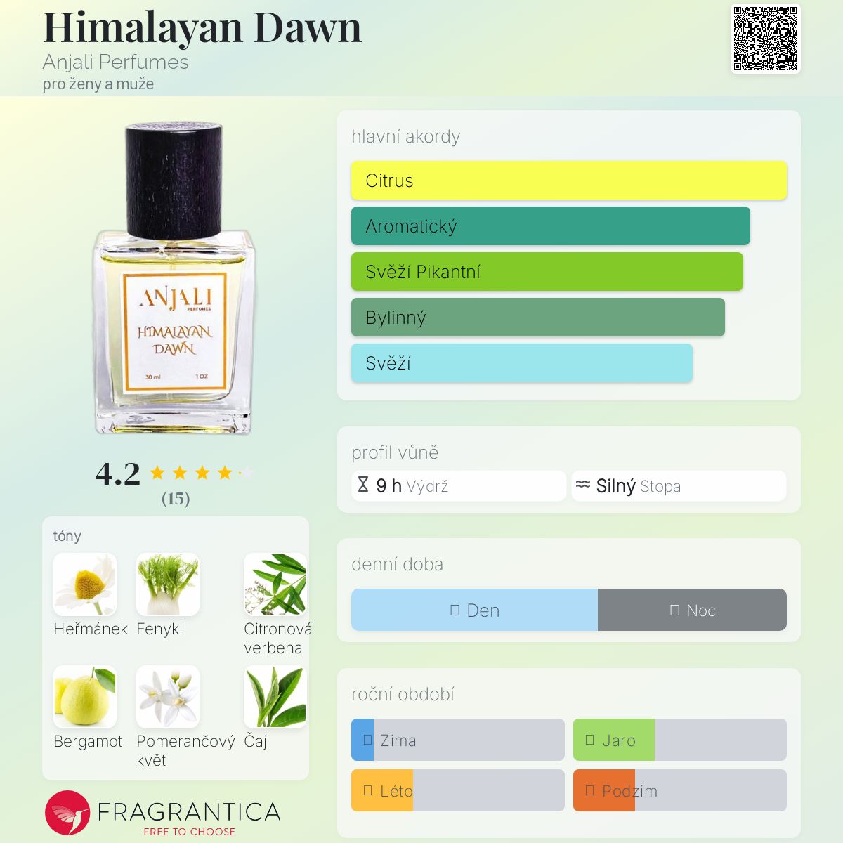 Himalayan Dawn podle Anjali Perfumes je Aromatic vůně pro ženy a muže. Himalayan Dawn byl/a uveden/a v roce 2021. "Nosem" za touto vůní je Anjali Vandemark. Vrchní tóny jsou Fenykl, Sporýš, Bergamot, Pomerančový květ, Kardamom a Betelový pepř; střední tóny jsouHeřmánek, Černý čaj, Jedle, Bulharská růže a Jasmín Sambac ; základní tóny jsou Santalové dřevo a Haitský vetiver.