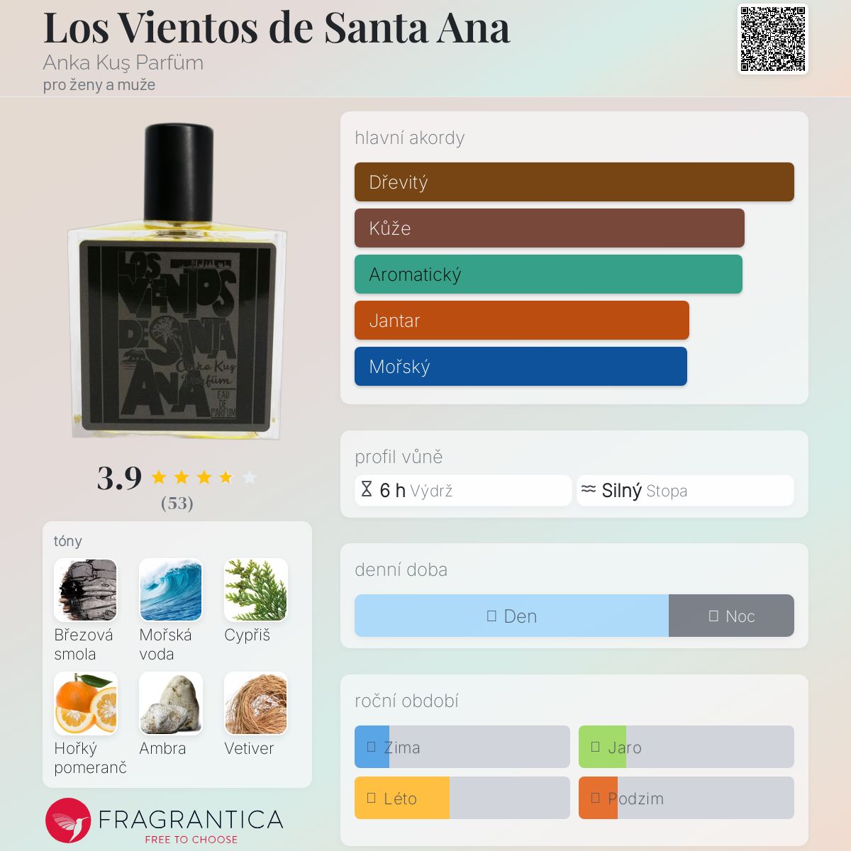Los Vientos de Santa Ana podle Anka Kuş Parfüm je Woody Aquatic vůně pro ženy a muže. Los Vientos de Santa Ana byl/a uveden/a v roce 2019. "Nosem" za touto vůní je Ali Erkekli. Vrchní tóny jsou Hořký pomeranč a Pomerančový květ; střední tóny jsouMořské tóny, Ambra a Jantar (ambra) ; základní tóny jsou Březová smola, Cypřiš, Vetiver, Guajakové dřevo a Dřevité tóny.