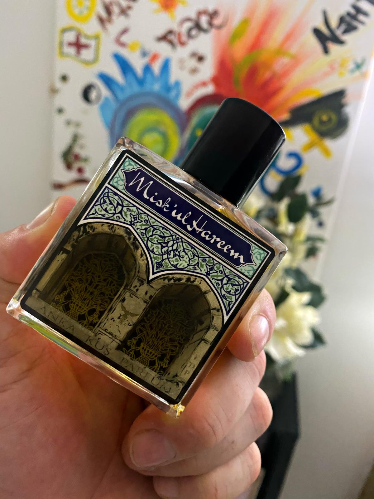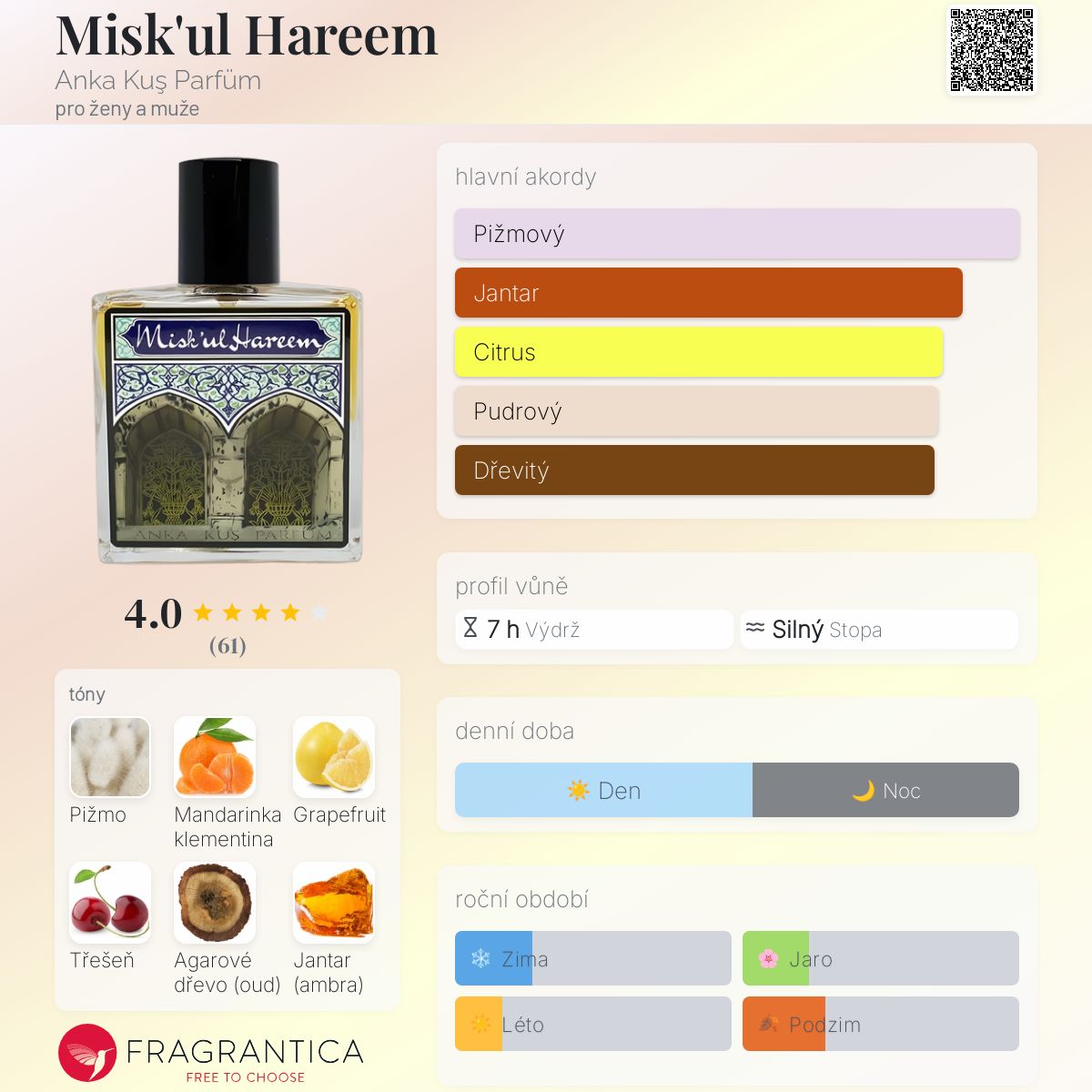 Misk'ul Hareem podle Anka Kuş Parfüm je vůně pro ženy a muže. Misk'ul Hareem byl/a uveden/a v roce 2021. "Nosem" za touto vůní je Ali Erkekli. Vrchní tóny jsou Pižmo, Mandarinka klementina a Růžový grapefruit; střední tóny jsouTřešeň, Myrta, Jasmín, Vanilka, Andělika, Pelargónie a Benzoin ; základní tóny jsou Agarové dřevo (oud), Jantar (ambra), Santalové dřevo, Cedr, Olibanum, Pačuli, Labdanum a Vetiver.