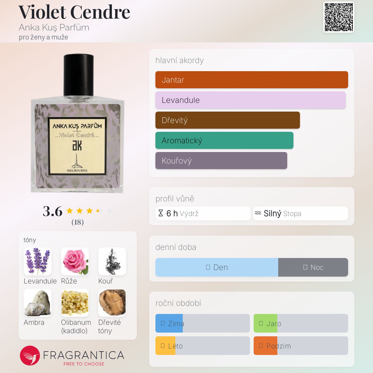 Violet Cendre podle Anka Kuş Parfüm je vůně pro ženy a muže. Violet Cendre byl/a uveden/a v roce 2021. "Nosem" za touto vůní je Ali Erkekli. Vrchní tón je Růže ; střední tóny jsouLevandule, Kouř, Ambra, Kosatec a Jasmín ; základní tóny jsou Olibanum, Dřevité tóny, Fazole tonka, Kůže, Jantar (ambra) a Dubový mech.