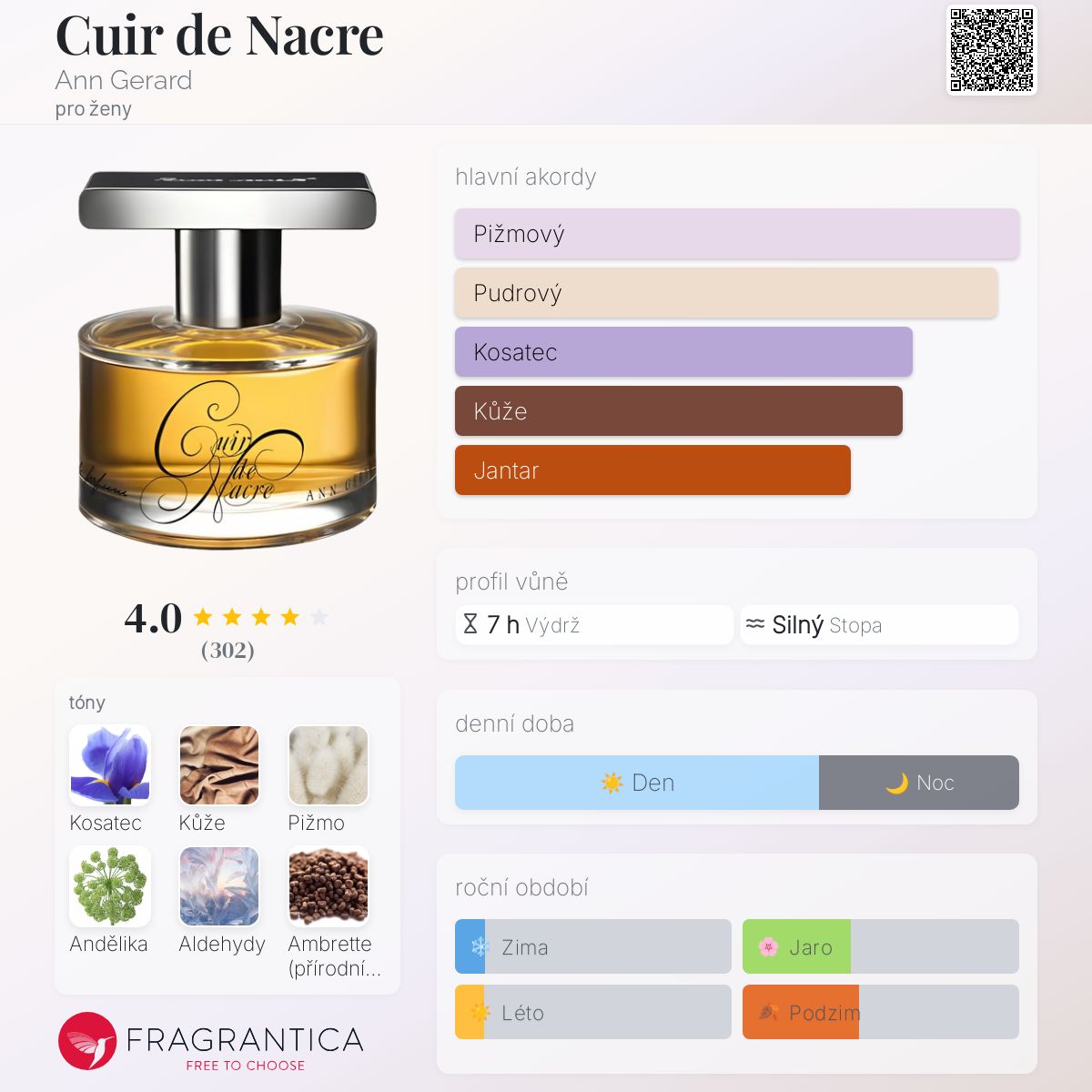 Cuir de Nacre podle Ann Gerard je Floral Aldehyde vůně pro ženy. Cuir de Nacre byl/a uveden/a v roce 2012. "Nosem" za touto vůní je Bertrand Duchaufour. Vrchní tóny jsou Andělika, Aldehydy a Ambrette (přírodní pižmo); střední tóny jsouKosatec, Kůže a Kasie ; základní tóny jsou Bílé pižmo, Styrax a Santalové dřevo.