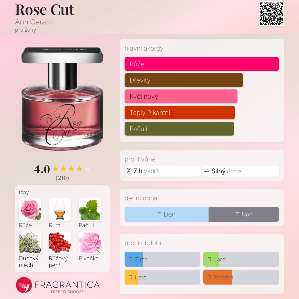 Rose Cut podle Ann Gerard je Chypre Floral vůně pro ženy. Rose Cut byl/a uveden/a v roce 2014. "Nosem" za touto vůní je Bertrand Duchaufour. Vrchní tóny jsou Rum, Růžový pepř a Aldehydy; střední tóny jsouRůže, Pačuli a Pivoňka ; základní tóny jsou Dubový mech, Benzoin a Vanilka.