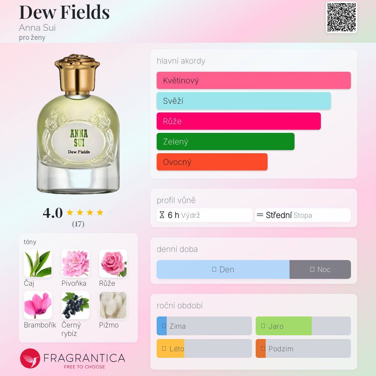 Dew Fields podle Anna Sui je Floral vůně pro ženy. Toto je nová vůně. Dew Fields byl/a uveden/a v roce 2024. "Nosem" za touto vůní je Jérôme Epinette. Vrchní tóny jsou Zelený čaj, Černý rybíz a Citrón; střední tóny jsouPivoňka, Růže a Brambořík ; základní tóny jsou Pižmo a Santalové dřevo.