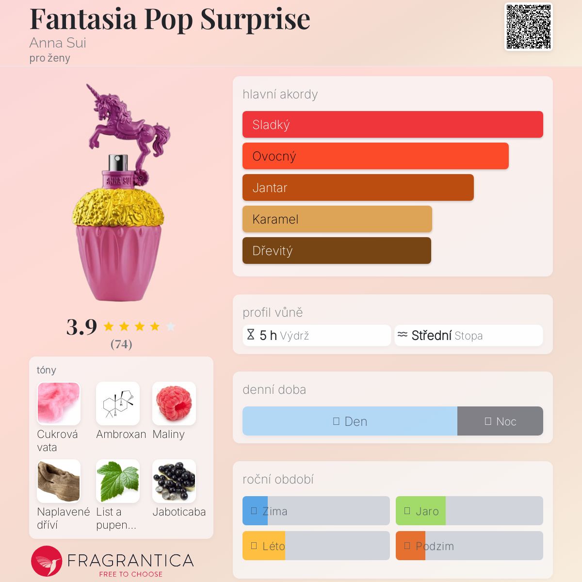 Fantasia Pop Surprise podle Anna Sui je Floral Fruity Gourmand vůně pro ženy. Fantasia Pop Surprise byl/a uveden/a v roce 2023. "Nosem" za touto vůní je Jérôme Epinette. Vrchní tóny jsou Maliny, Černý rybíz a Jaboticaba; střední tóny jsouJasmín Sambac a Brambořík ; základní tóny jsou Cukrová vata, Ambroxan a Naplavené dříví.