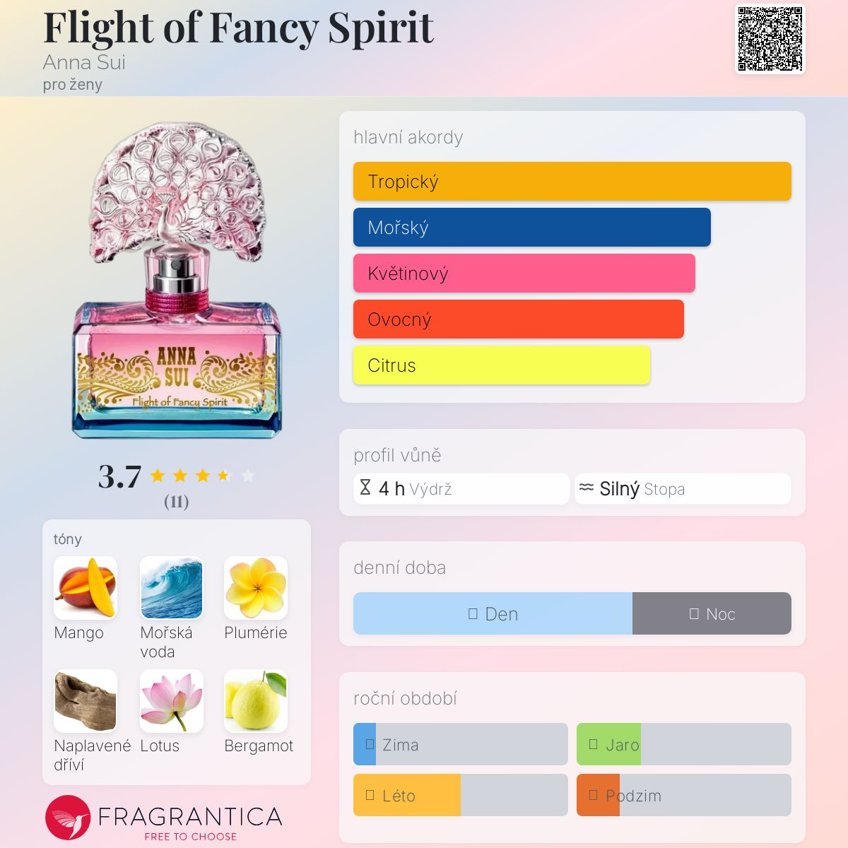 Flight of Fancy Spirit podle Anna Sui je Floral Fruity vůně pro ženy. Flight of Fancy Spirit byl/a uveden/a v roce 2018. Vrchní tóny jsou Mango, Bergamot a Citrusy; střední tóny jsouPlumérie, Lotus a Gardénie ; základní tóny jsou Mořská voda, Naplavené dříví a Pižmo.
