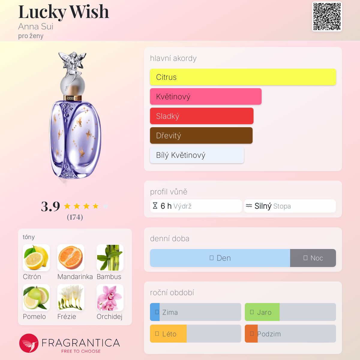 Lucky Wish podle Anna Sui je Floral Fruity vůně pro ženy. Lucky Wish byl/a uveden/a v roce 2016. "Nosem" za touto vůní je Mathieu Nardin. Vrchní tóny jsou Ledový citrón, Mandarinka a Pomelo; střední tóny jsouBambus, Frézie, Orchidej a Pomerančový květ ; základní tóny jsou Pižmo, Jantar (ambra) a Santalové dřevo.