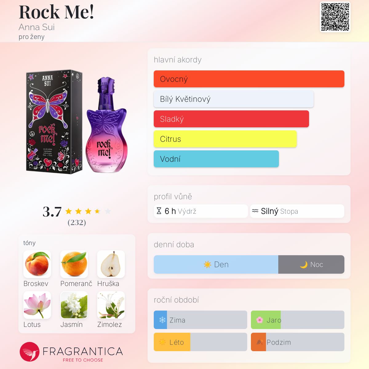 Rock Me! podle Anna Sui je Floral Fruity vůně pro ženy. Rock Me! byl/a uveden/a v roce 2009. Vrchní tóny jsou Broskev, Pomeranč a Hruška; střední tóny jsouLotus, Jasmín a Zimolez ; základní tóny jsou Vanilka, Virginský cedr a Jantar (ambra).