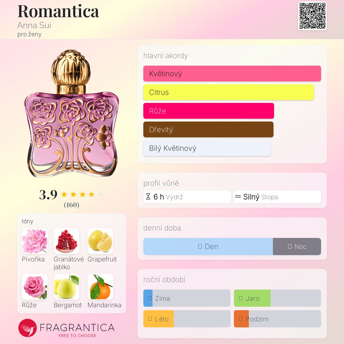Romantica podle Anna Sui je Floral Fruity vůně pro ženy. Romantica byl/a uveden/a v roce 2015. Vrchní tóny jsou Granátové jablko, Grapefruit, Kalábrijský bergamot a Mandarinka; střední tóny jsouRůžová pivoňka, Květná růže, Jasmín, Vonokvětka, Hortensie, Pomerančový květ a Lilie ; základní tóny jsou Jantar (ambra), Pižmo, Santalové dřevo a Extrakt z bílého cedru.