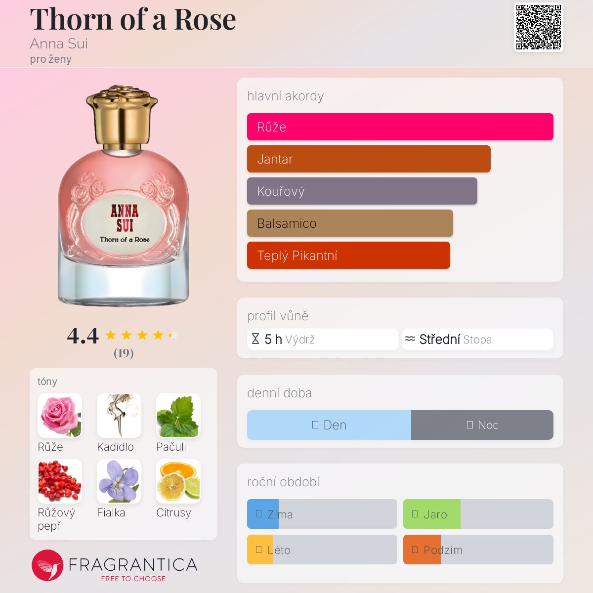 Thorn of a Rose podle Anna Sui je Floral Woody Musk vůně pro ženy. Toto je nová vůně. Thorn of a Rose byl/a uveden/a v roce 2024. "Nosem" za touto vůní je Jérôme Epinette. Vrchní tóny jsou Růžový pepř a Citrusy; střední tóny jsouDamašská růže a Fialka ; základní tóny jsou Kadidlo a Pačuli.