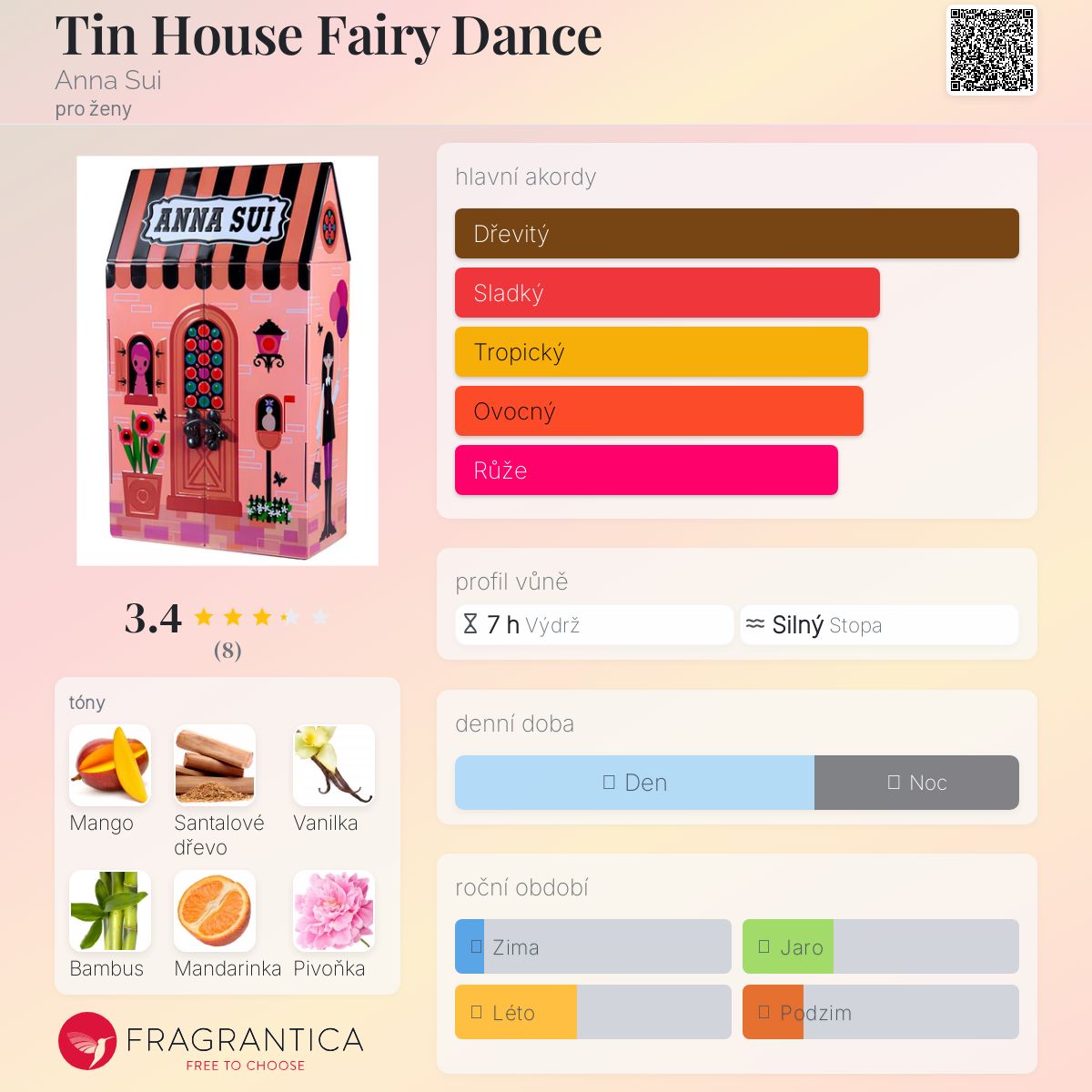 Tin House Fairy Dance podle Anna Sui je Floral Fruity vůně pro ženy. Tin House Fairy Dance byl/a uveden/a v roce 2013. Vrchní tóny jsou Mango, Mandarinka a Růžový pepř; střední tóny jsouBambus, Pivoňka a Růže ; základní tóny jsou Santalové dřevo, Vanilka a Vetiver.