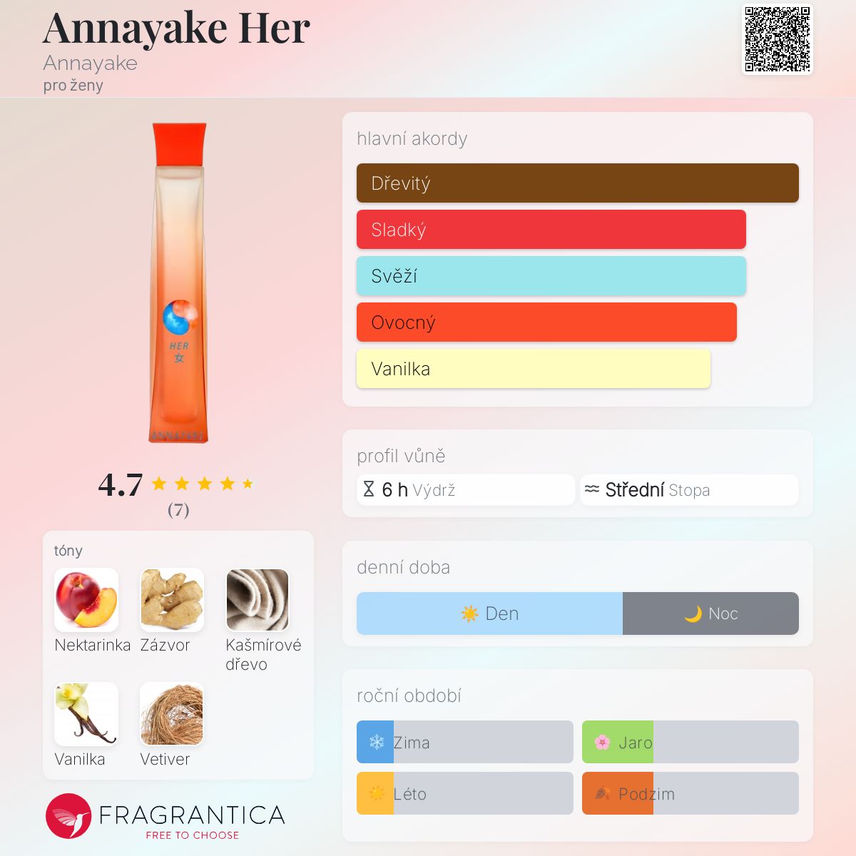 Annayake Her podle Annayake je vůně pro ženy. Annayake Her byl/a uveden/a v roce 2022. "Nosem" za touto vůní je Celine Ripert. Vrchní tón je Zázvor ; střední tóny jsouNektarinka a Kašmírové dřevo ; základní tóny jsou Vanilka a Vetiver.