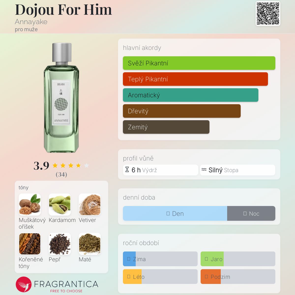 Dojou For Him podle Annayake je vůně pro muže. Dojou For Him byl/a uveden/a v roce 2022. Vrchní tóny jsou Koření, Černý pepř a Citrusy; střední tóny jsouMuškátový oříšek, Kardamom a Maté ; základní tóny jsou Vetiver, Cedr a Jantar (ambra).