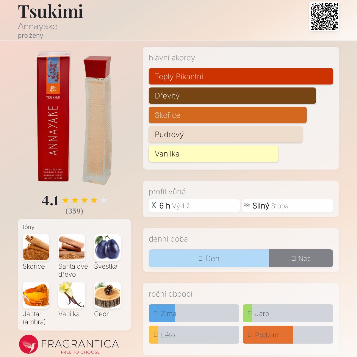 Tsukimi podle Annayake je Orientální Spicy vůně pro ženy. Tsukimi byl/a uveden/a v roce 2003. Vrchní tóny jsou Grapefruit a Citrón; střední tóny jsouSkořice, Santalové dřevo, Švestka, Jantar (ambra), Vanilka, Cedr, Otočník, Karafiát, Fialka a Jasmín ; základní tóny jsou Santalové dřevo, Vanilka a Pačuli.
