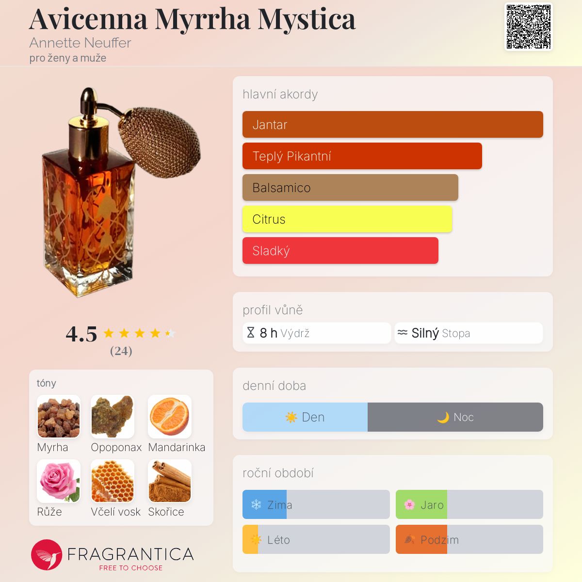 Avicenna Myrrha Mystica podle Annette Neuffer je Orientální Spicy vůně pro ženy a muže. "Nosem" za touto vůní je Annette Neuffer. Vrchní tóny jsou Mandarinka, Skořice, Petitgrain, Šafrán, Kardamom, Zázvor, Bergamot a Černý pepř; střední tóny jsouMyrha, Marocká růže, Bulharská růže, Růže, Olibanum, Elimi, Pomerančový květ, Jasmín, Tuberóza a Kručinka barvířská ; základní tóny jsou Myrha, Opoponax, Včelí vosk, Santalové dřevo, Siamský (thajský) benzoin, Labdanum a Bourbonská vanilka.
