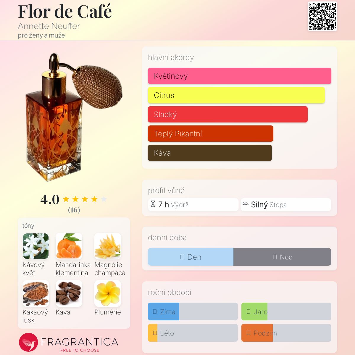 Flor de Café podle Annette Neuffer je Orientální Vanilla vůně pro ženy a muže. "Nosem" za touto vůní je Annette Neuffer. Vrchní tóny jsou Mandarinka klementina, Hořký pomeranč, Kručinka barvířská, Bílý grapefruit a Galbanum; střední tóny jsouKávový květ, Magnólie champaca, Káva, Plumérie, Ylang-Ylang a Tuberóza ; základní tóny jsou Kakaový lusk, Bourbonská vanilka, Fazole tonka, Pryskyřice, Bylinné tóny, Dřevité tóny a Pačuli.