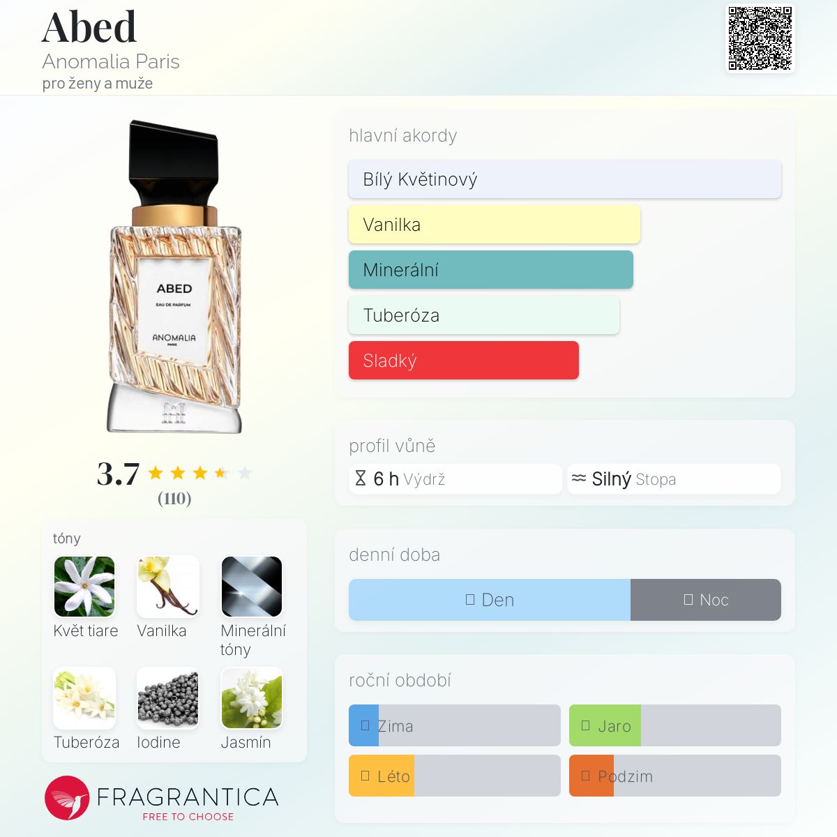 Abed podle Anomalia Paris je vůně pro ženy a muže. Abed byl/a uveden/a v roce 2022. "Nosem" za touto vůní je Ane Ayo. Vrchní tóny jsou Minerální tóny, Jód a Cejlonská skořice; střední tóny jsouKvět tiare, Tuberóza a Jasmín Sambac ; základní tóny jsou Vanilka, Peruánský balzám a Myrha.