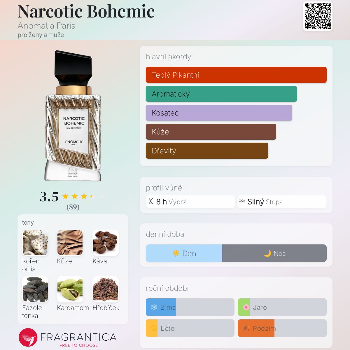 Narcotic Bohemic podle Anomalia Paris je vůně pro ženy a muže. Narcotic Bohemic byl/a uveden/a v roce 2022. Vrchní tóny jsou Kardamom, Hřebíček a Šalvěj muškátová; střední tóny jsouKořen orris, Káva a Cedr ; základní tóny jsou Kůže, Fazole tonka, Vetiver a Tabák.