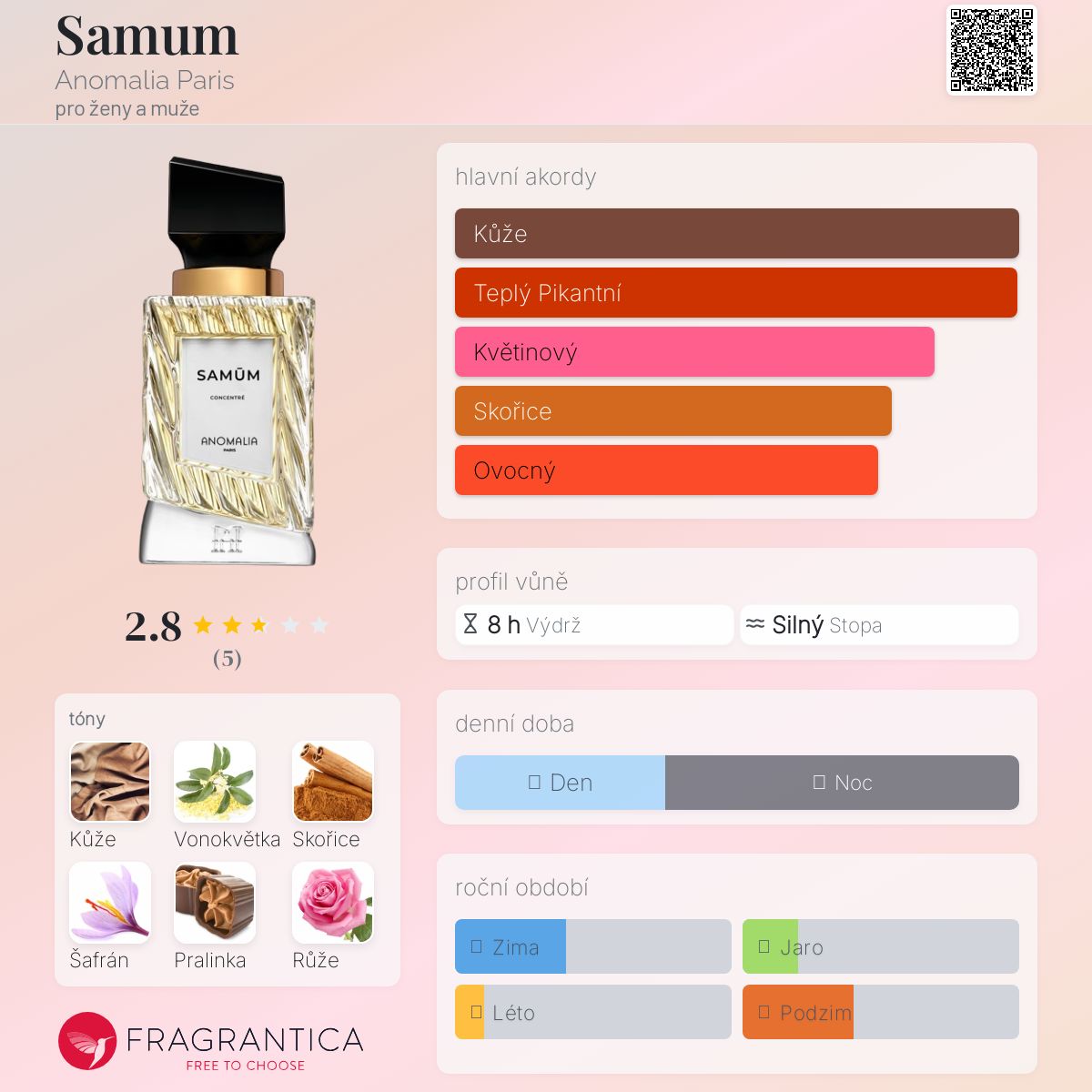 Samum podle Anomalia Paris je vůně pro ženy a muže. Samum byl/a uveden/a v roce 2025. "Nosem" za touto vůní je Karine Vinchon Spehner. Vrchní tóny jsou Skořice, Šafrán a Pralinka; střední tóny jsouKůže, Vonokvětka, Skalní růže a Kadidlo ; základní tóny jsou Pačuli, Papyrus, Dubový mech a Cedr.