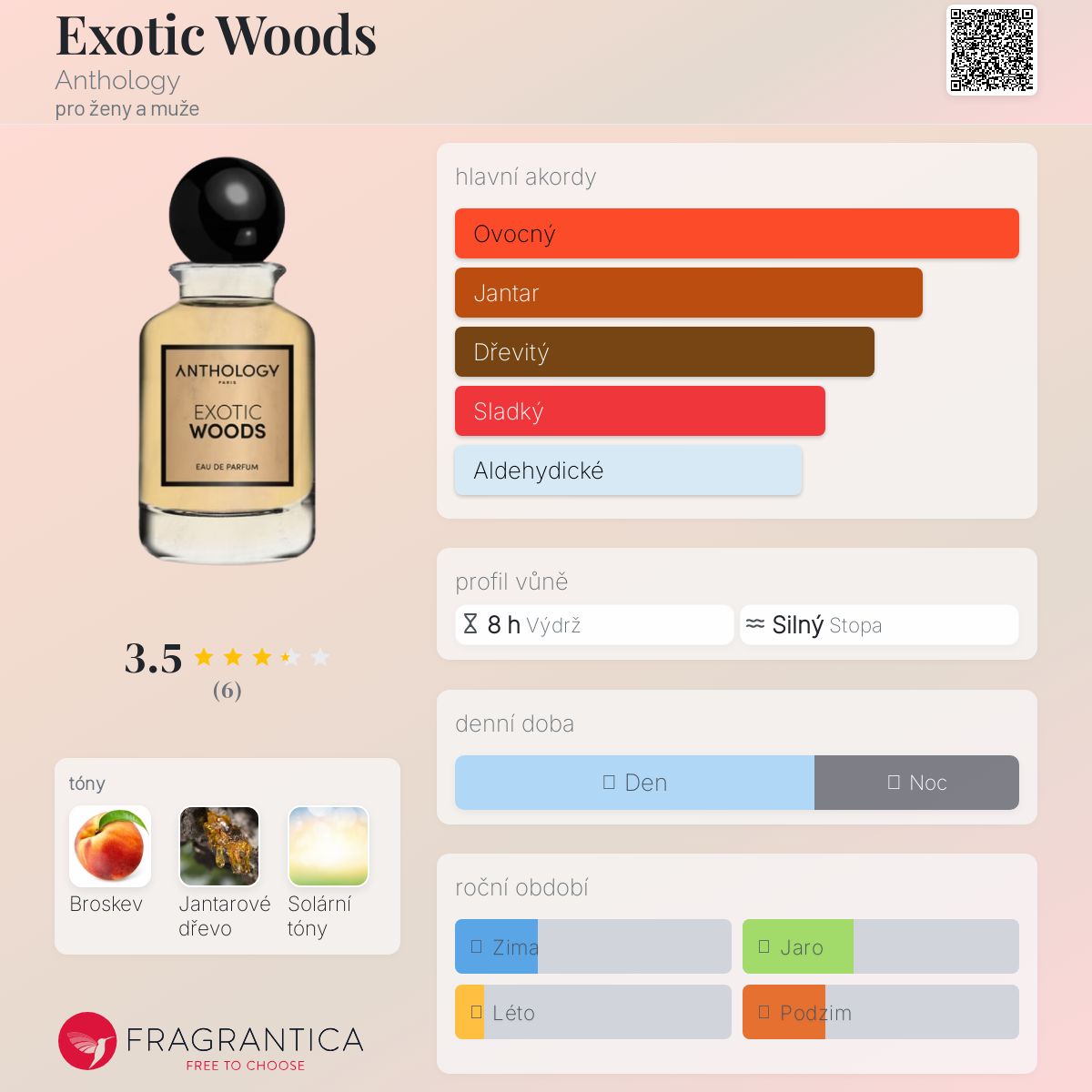 Exotic Woods podle Anthology je vůně pro ženy a muže. Exotic Woods byl/a uveden/a v roce 2023. Vrchní tón je Broskev ; střední tón jeJantarové dřevo ; základní tón je Solární tóny.
