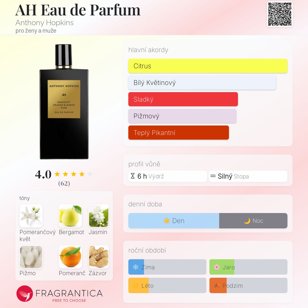 AH Eau de Parfum podle Anthony Hopkins je Orientální Floral vůně pro ženy a muže. AH Eau de Parfum byl/a uveden/a v roce 2020. Vrchní tóny jsou Bergamot, Pomeranč, Zázvor a Růžový pepř; střední tóny jsouPomerančový květ, Jasmín a Růže ; základní tóny jsou Pižmo, Med a Pačuli.