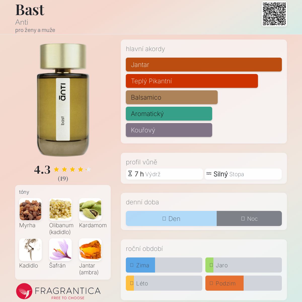 Bast podle Anti je Orientální Woody vůně pro ženy a muže. Toto je nová vůně. Bast byl/a uveden/a v roce 2025. "Nosem" za touto vůní je Sidonie Lancesseur. Vrchní tóny jsou Kadidlo a Kardamom; střední tóny jsouKadidlo, Šafrán a Cypriolový olej ; základní tóny jsou Myrha a Jantar (ambra).