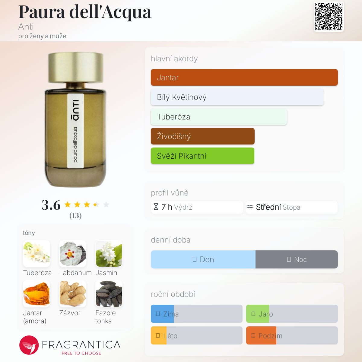 Paura dell'Acqua podle Anti je vůně pro ženy a muže. Toto je nová vůně. Paura dell'Acqua byl/a uveden/a v roce 2025. "Nosem" za touto vůní je Sidonie Lancesseur. Vrchní tóny jsou Zázvor, Petitgrain a Mandarinka; střední tóny jsouTuberóza, Jasmín a Růže ; základní tóny jsou Labdanum, Jantar (ambra) a Fazole tonka.