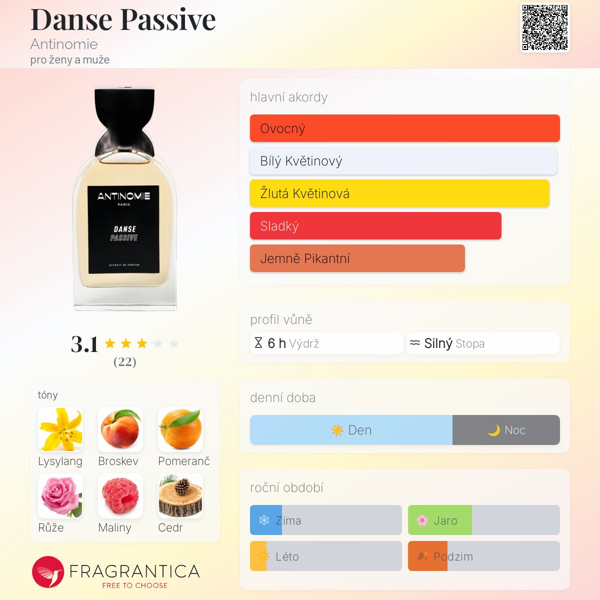 Danse Passive podle Antinomie je Orientální Vanilla vůně pro ženy a muže. Toto je nová vůně. Danse Passive byl/a uveden/a v roce 2022. Vrchní tóny jsou Broskev, Pomeranč, Růže a Maliny; střední tóny jsouLysylang, Cedr, Jasmín a Konvalinka ; základní tóny jsou Pižmo, Jantar (ambra), Vanilka, Santalové dřevo a Pačuli.