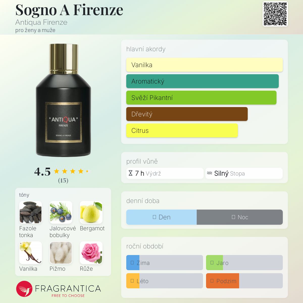Sogno A Firenze podle Antiqua Firenze je vůně pro ženy a muže. Sogno A Firenze byl/a uveden/a v roce 2017. "Nosem" za touto vůní je Enzo Galardi. Vrchní tóny jsou Bergamot a Černý pepř; střední tóny jsouJalovcové bobulky, Turecká růže, Růžový olej a Jasmín ; základní tóny jsou Fazole tonka, Vanilka, Bílé pižmo a Extrakt z bílého cedru.