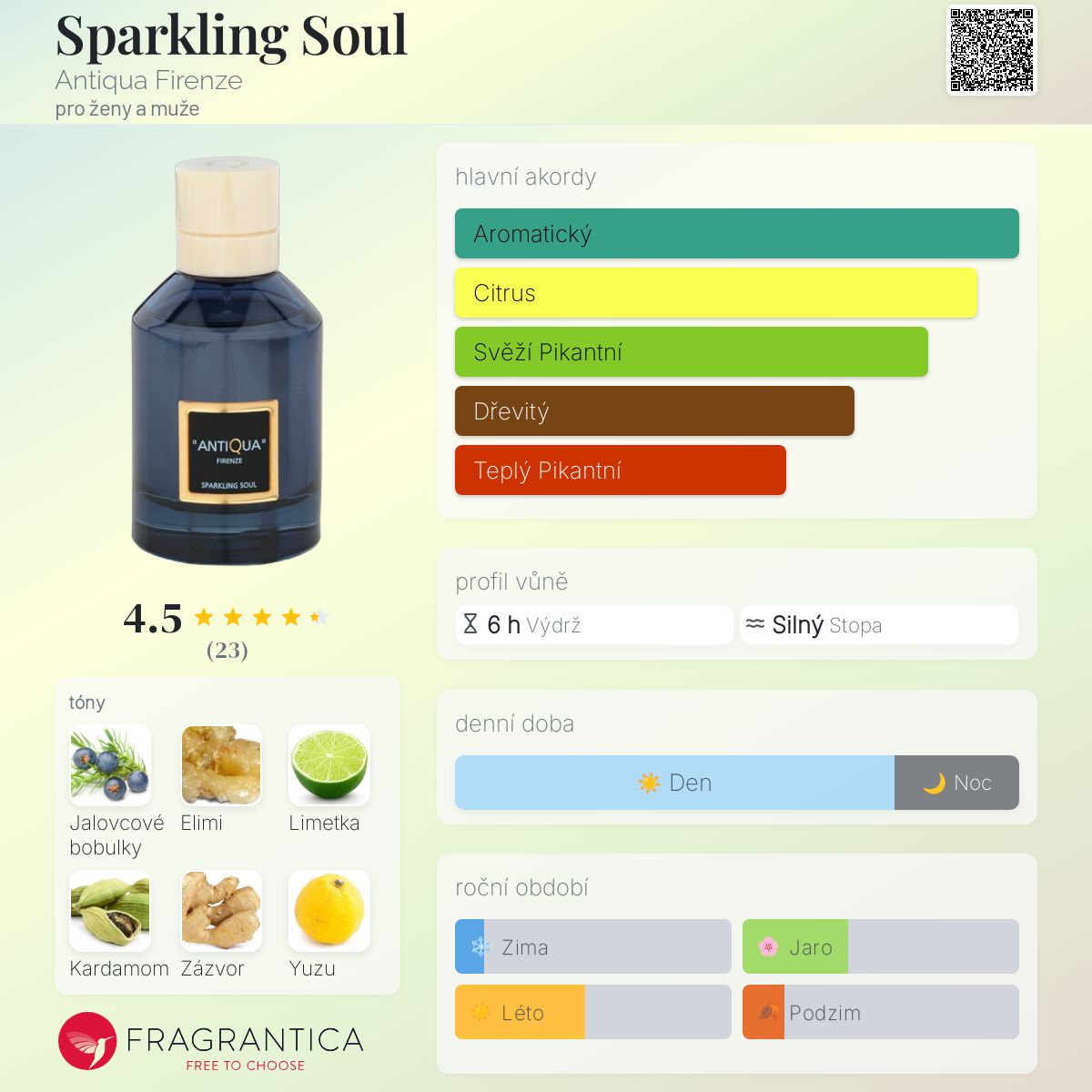 Sparkling Soul podle Antiqua Firenze je Floral vůně pro ženy a muže. Sparkling Soul byl/a uveden/a v roce 2023. "Nosem" za touto vůní je Enzo Galardi. Vrchní tóny jsou Limetka, Yuzu, Krvavý pomeranč a Citrón; střední tóny jsouJalovcové bobulky, Elimi, Kardamom, Zázvor a Růžový pepř ; základní tóny jsou Haitský vetiver, Bílé dřevo a Pižmo.