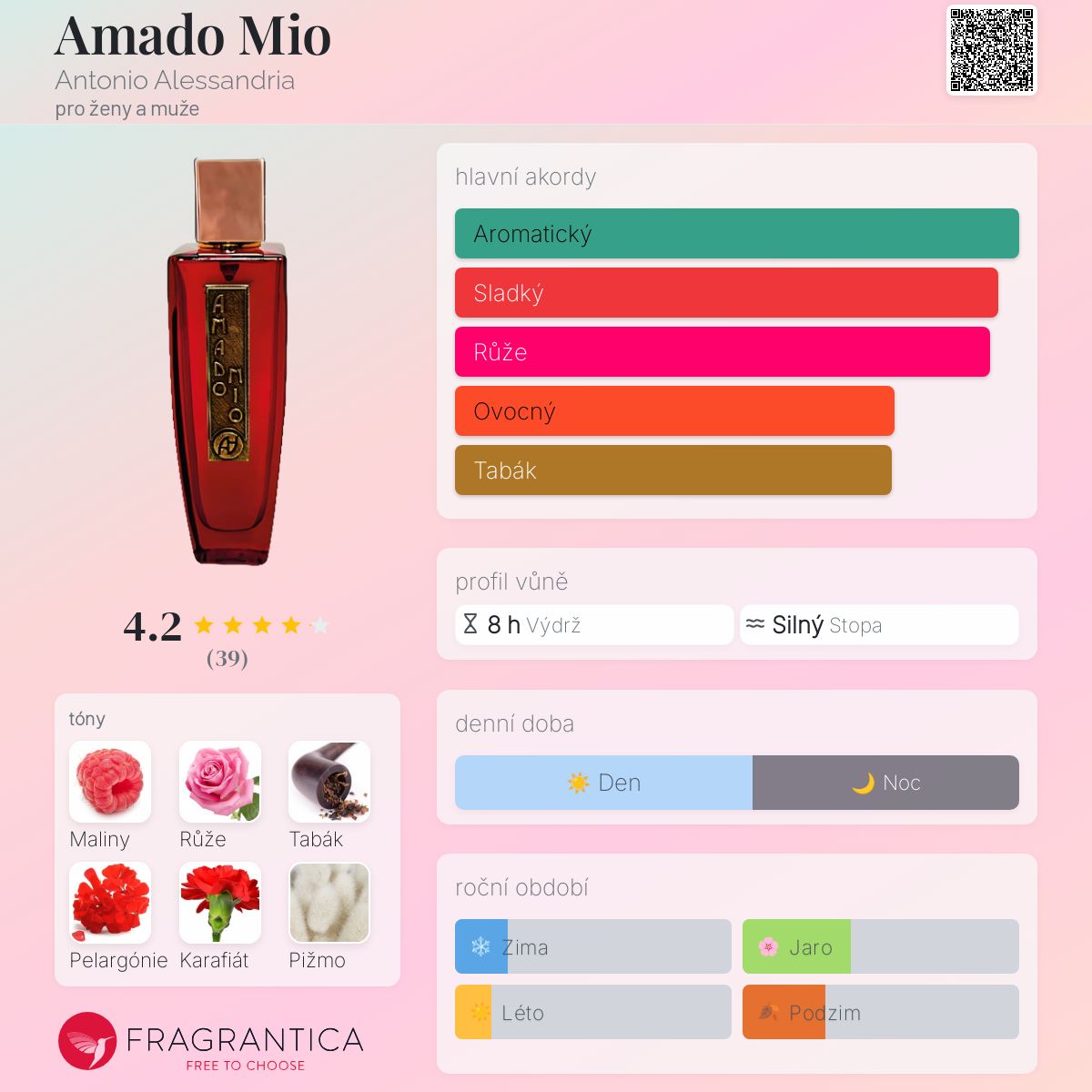 Amado Mio podle Antonio Alessandria je vůně pro ženy a muže. Amado Mio byl/a uveden/a v roce 2023. "Nosem" za touto vůní je Antonio Alessandria. Vrchní tóny jsou Maliny, Šalvěj muškátová, Zelené tóny a Levandule; střední tóny jsouRůže, Pelargónie a Karafiát ; základní tóny jsou Tabák, Pižmo, Jantar (ambra), Zrna, Fazole tonka, Vetiver, Slaměnka a Cedr.