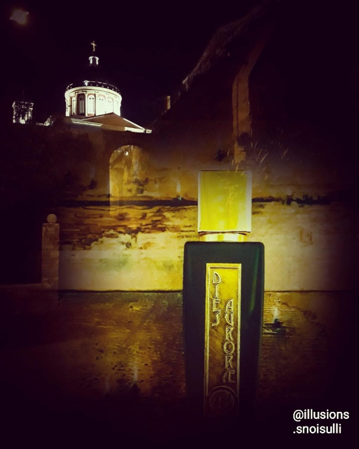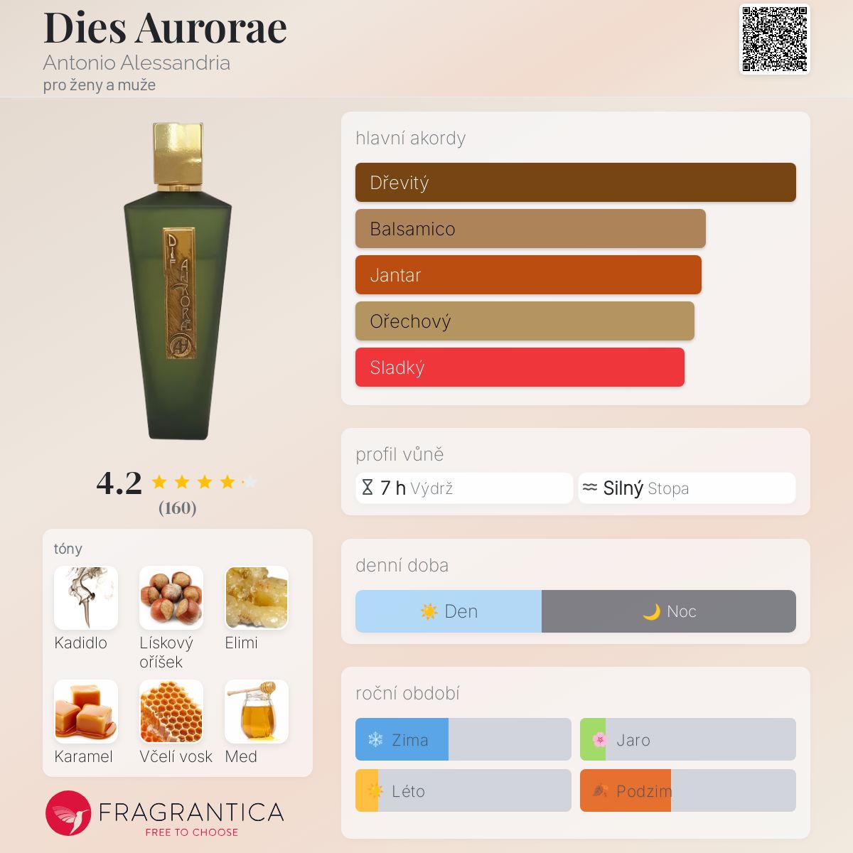 Dies Aurorae podle Antonio Alessandria je Woody vůně pro ženy a muže. Dies Aurorae byl/a uveden/a v roce 2019. "Nosem" za touto vůní je Antonio Alessandria. Vrchní tóny jsou Lískový oříšek, Elimi, Karamel, Pistácie a Mandle; střední tóny jsouKadidlo, Včelí vosk a Med ; základní tóny jsou Cedr, Vanilka, Fazole tonka, Pačuli, Pižmo a Santalové dřevo.