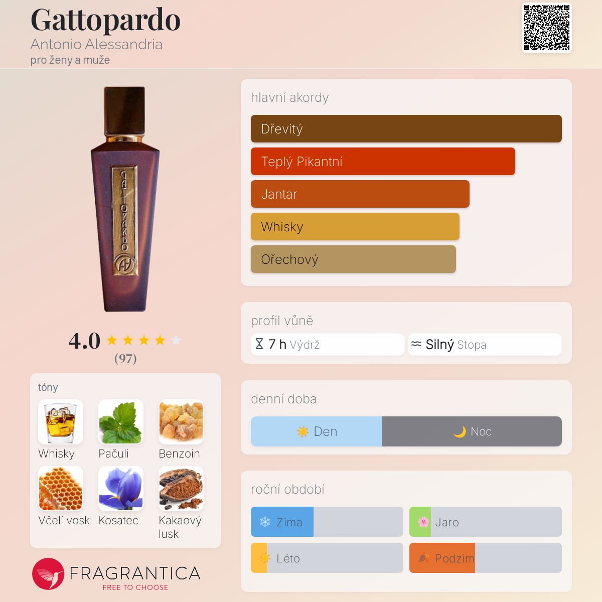 Gattopardo podle Antonio Alessandria je vůně pro ženy a muže. Gattopardo byl/a uveden/a v roce 2017. "Nosem" za touto vůní je Antonio Alessandria. Vrchní tóny jsou Whisky, Fíkový nektar a Bergamot; střední tóny jsouKosatec a Pelargónie ; základní tóny jsou Pačuli, Benzoin, Včelí vosk, Kakao, Lískový oříšek, Mandle, Pižmo, Jantar (ambra) a Cedr.