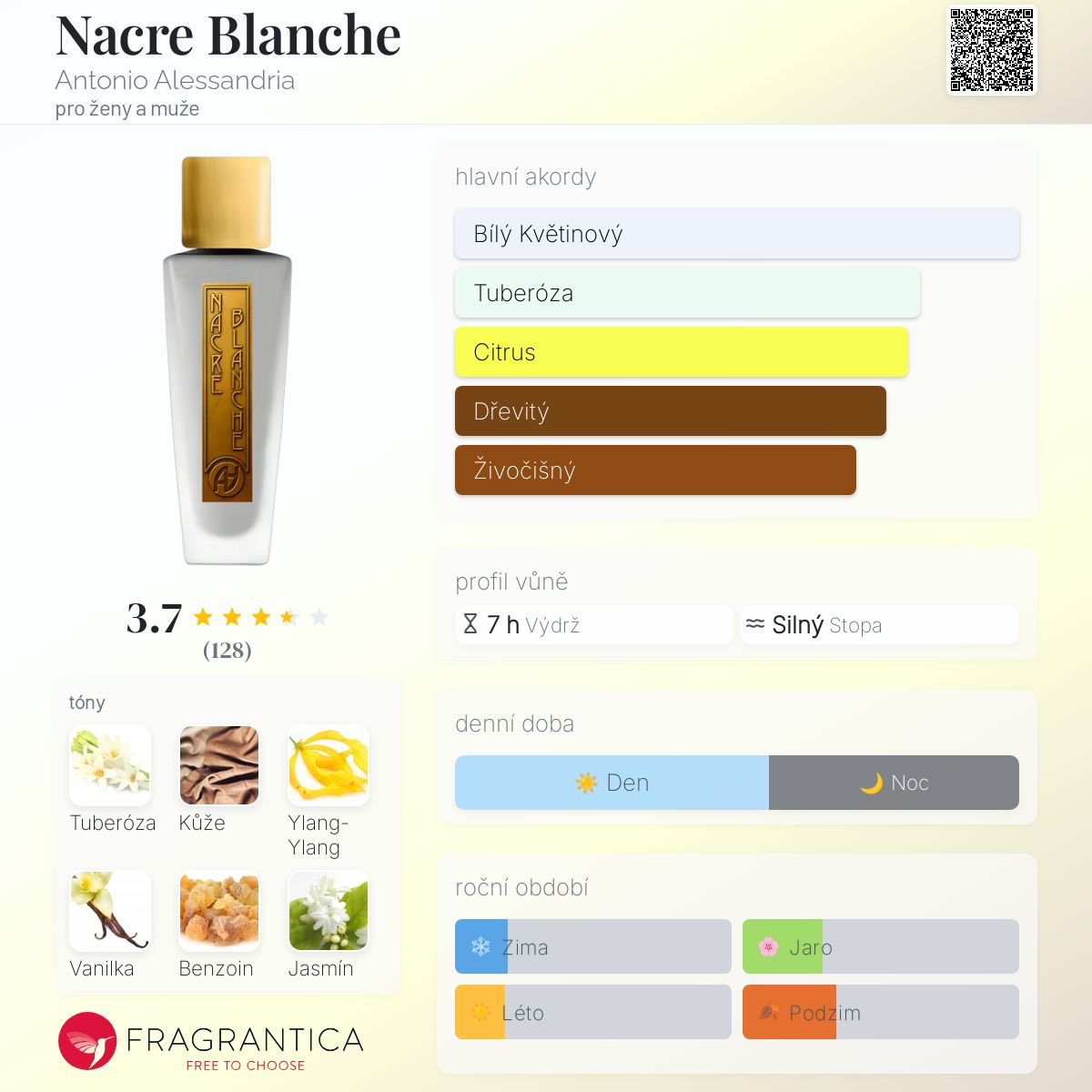 Nacre Blanche podle Antonio Alessandria je Floral Woody Musk vůně pro ženy a muže. Nacre Blanche byl/a uveden/a v roce 2014. "Nosem" za touto vůní je Antonio Alessandria. Vrchní tóny jsou Koriandr, Mandarinka, Petitgrain, Bergamot a Grapefruit; střední tóny jsouTuberóza, Ylang-Ylang, Jasmín a Vonokvětka ; základní tóny jsou Kůže, Vanilka, Benzoin, Pižmo, Santalové dřevo a Pačuli.