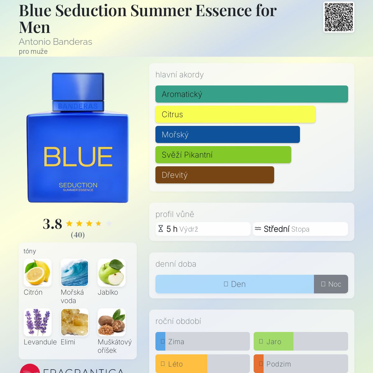 Blue Seduction Summer Essence for Men podle Antonio Banderas je Aromatic Fougere vůně pro muže. Toto je nová vůně. Blue Seduction Summer Essence for Men byl/a uveden/a v roce 2024. Blue Seduction Summer Essence for Men byl/a vytvořen/a Olivier Cresp a Nicolas Bonneville. Vrchní tóny jsou Citrón, Mořské tóny a Granny Smith jablko; střední tóny jsouLevandule, Muškátový oříšek a Kardamom ; základní tóny jsou Elimi, Jantarové dřevo, Pižmo a Guajakové dřevo.