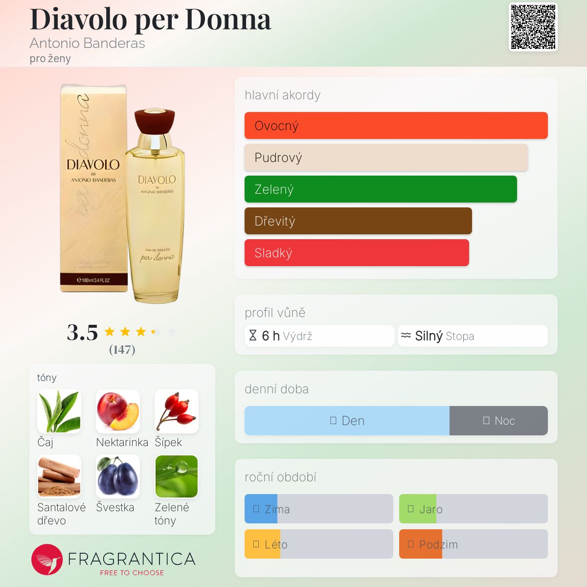 Diavolo per Donna podle Antonio Banderas je Orientální Floral vůně pro ženy. Diavolo per Donna byl/a uveden/a v roce 1999. Vrchní tóny jsou Zelený čaj, Zelené listí a Grapefruit; střední tóny jsouNektarinka, Šípek a Fialka ; základní tóny jsou Santalové dřevo, Švestka a Pižmo.