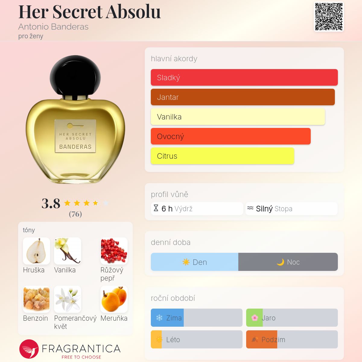 Her Secret Absolu podle Antonio Banderas je vůně pro ženy. Toto je nová vůně. Her Secret Absolu byl/a uveden/a v roce 2024. Vrchní tóny jsou Hruška, Meruňka a Pomeranč; střední tóny jsouRůžový pepř, Pomerančový květ a Růže ; základní tóny jsou Vanilka, Benzoin, Labdanum a Santalové dřevo.