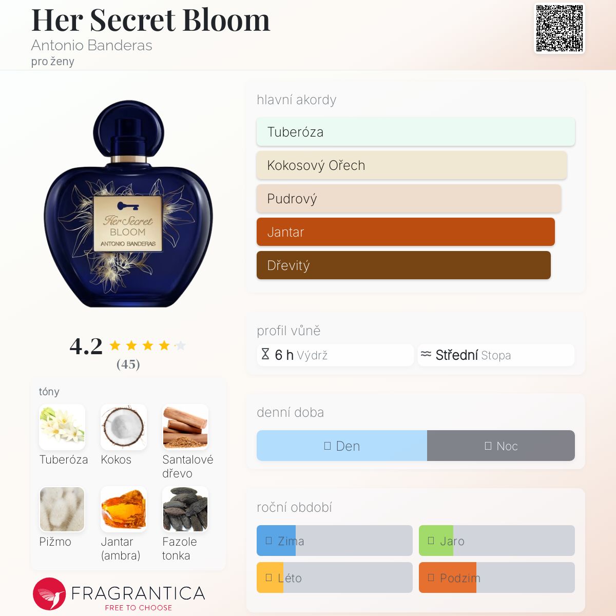 Her Secret Bloom podle Antonio Banderas je vůně pro ženy. Her Secret Bloom byl/a uveden/a v roce 2021. Vrchní tóny jsou Bergamot, Šafrán a Mandarinka; střední tóny jsouTuberóza, Kokosový nektar a Ozonové tóny ; základní tóny jsou Santalové dřevo, Pižmo, Jantar (ambra) a Fazole tonka.