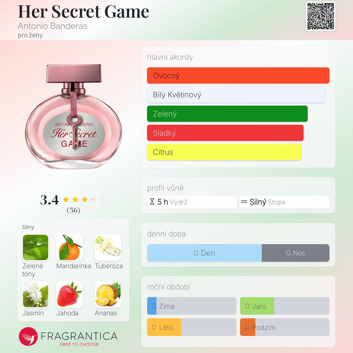 Her Secret Game podle Antonio Banderas je Floral Fruity vůně pro ženy. Her Secret Game byl/a uveden/a v roce 2015. "Nosem" za touto vůní je Sonia Constant. Vrchní tóny jsou Mandarinka, Jahoda, Ananas, Bergamot a Maliny; střední tóny jsouZelené listí, Tuberóza, Jasmín a Gardénie ; základní tóny jsou Pižmo, Pačuli a Santalové dřevo.