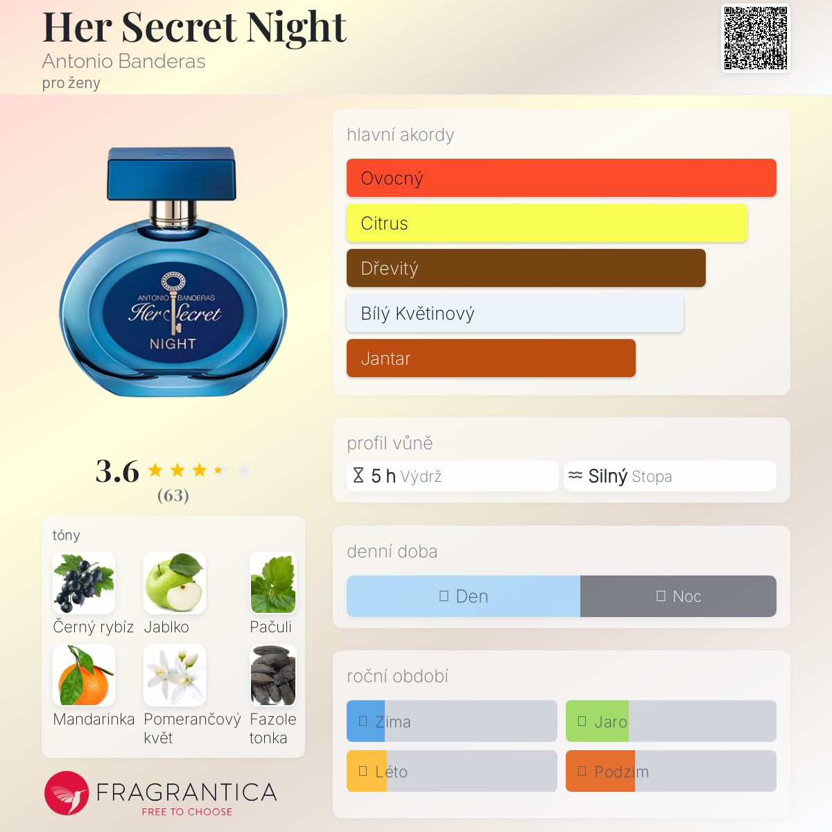 Her Secret Night podle Antonio Banderas je Orientální Floral vůně pro ženy. Her Secret Night byl/a uveden/a v roce 2016. Vrchní tóny jsou Černý rybíz, Zelené jablko, Mandarinka a Citrón; střední tóny jsouPomerančový květ a Gardénie ; základní tóny jsou Pačuli, Fazole tonka, Santalové dřevo a Jantar (ambra).