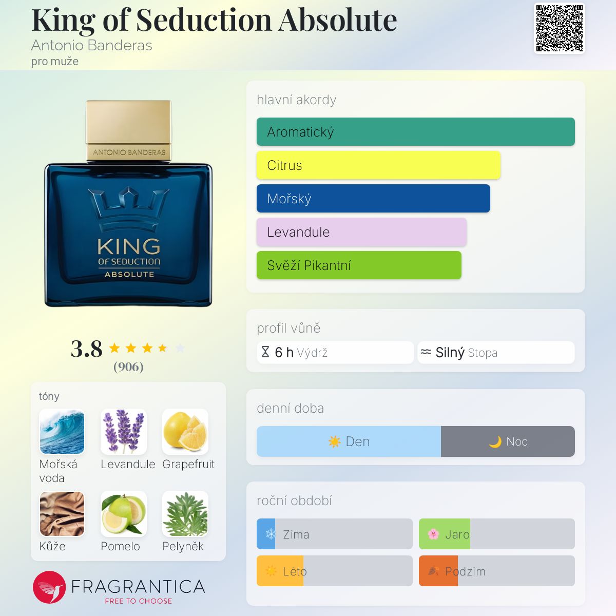 King of Seduction Absolute podle Antonio Banderas je Woody Aromatic vůně pro muže. King of Seduction Absolute byl/a uveden/a v roce 2015. Vrchní tóny jsou Grapefruit, Pomelo, Pelyněk a Zelená mandle; střední tóny jsouMořské tóny, Levandule a Kardamom ; základní tóny jsou Kůže, Vetiver a Dubový mech.