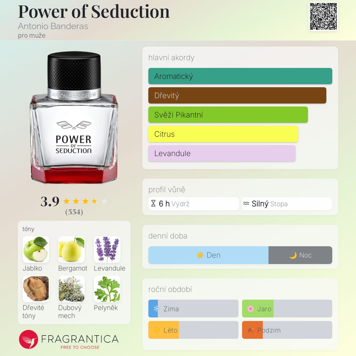 Power of Seduction podle Antonio Banderas je Aromatic Green vůně pro muže. Power of Seduction byl/a uveden/a v roce 2018. Vrchní tóny jsou Jablko a Bergamot; střední tóny jsouLevandule, Pelyněk a Šalvěj muškátová ; základní tóny jsou Dřevité tóny, Mech, Fazole tonka, Jantar (ambra) a Pačuli.