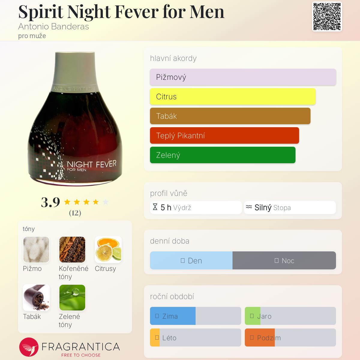 Spirit Night Fever for Men podle Antonio Banderas je Woody Spicy vůně pro muže. Spirit Night Fever for Men byl/a uveden/a v roce 2006. Vrchní tón je Citrusy ; střední tóny jsouKoření a Zelené tóny ; základní tóny jsou Pižmo a Tabák.