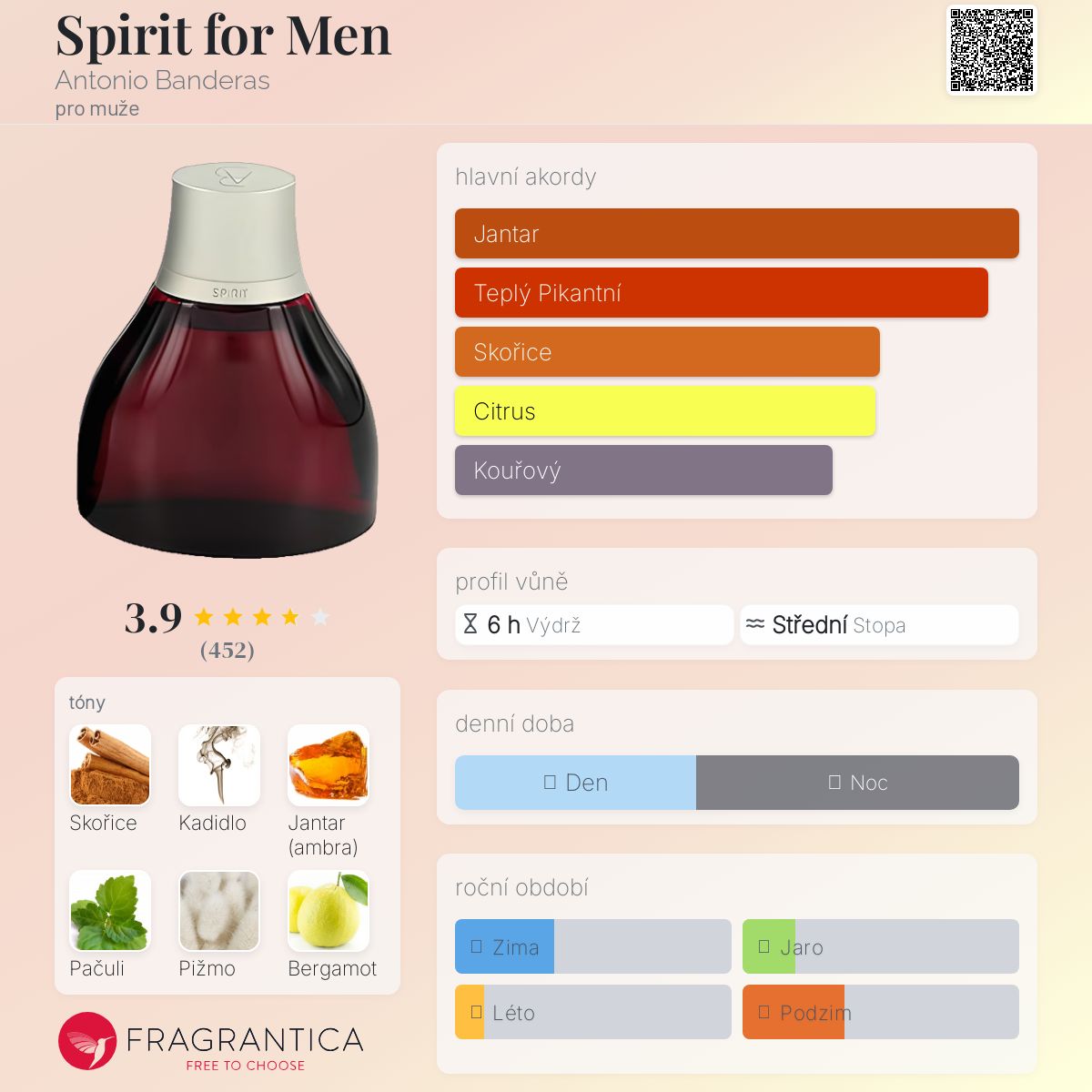 Spirit for Men podle Antonio Banderas je Orientální vůně pro muže. Spirit for Men byl/a uveden/a v roce 2003. Spirit for Men byl/a vytvořen/a Pierre Wargnye a Rosendo Mateu. Tento parfém je vítězem 2 ocenění: FiFi Award Best Packaging Men`s Popular Appeal 2005 a FiFi Award Fragrance Of The Year Men`s Popular Appeal 2005 .