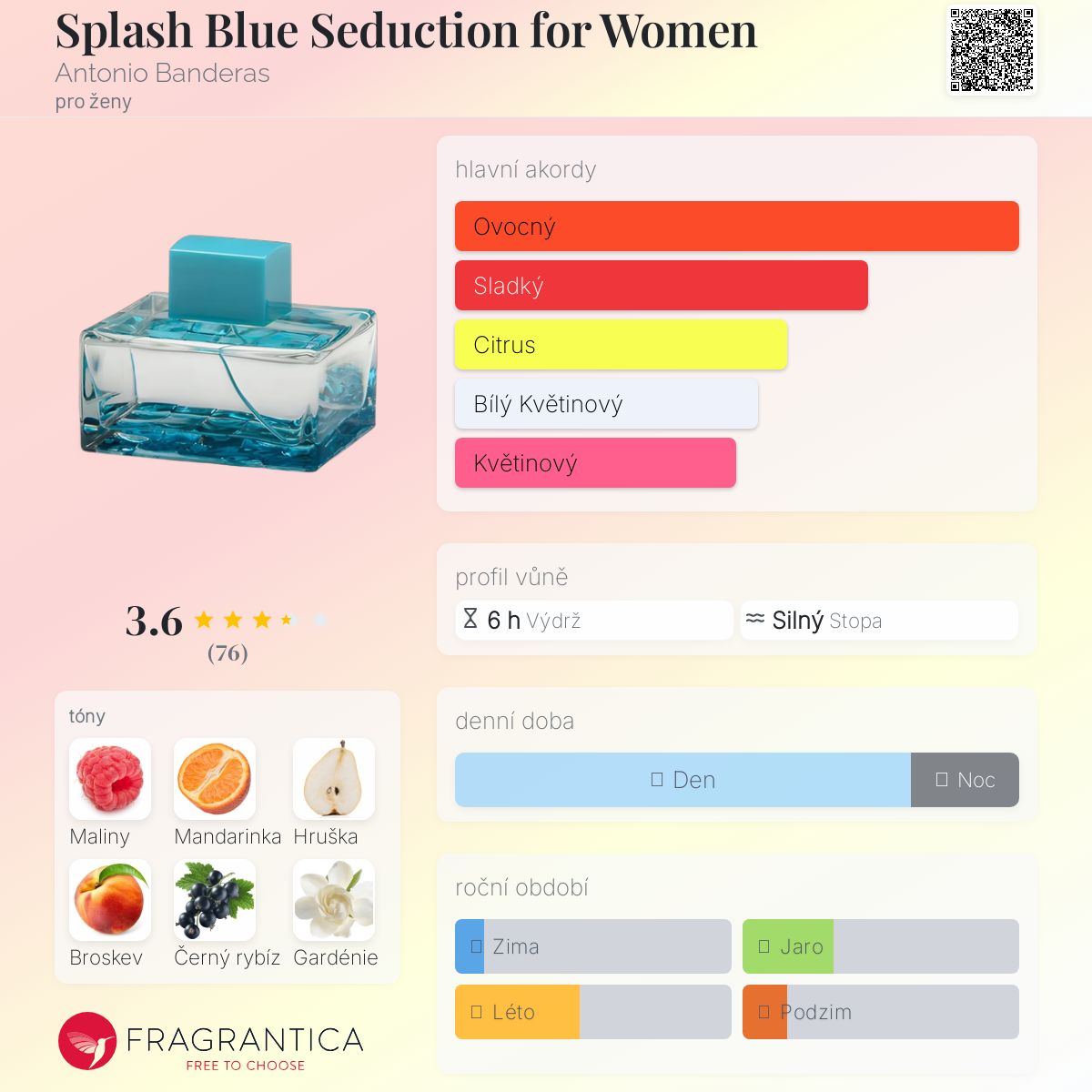Splash Blue Seduction for Women podle Antonio Banderas je Floral Fruity vůně pro ženy. Splash Blue Seduction for Women byl/a uveden/a v roce 2012. "Nosem" za touto vůní je Olivier Cresp. Vrchní tóny jsou Mandarinka, Hruška, Broskev a Černý rybíz; střední tóny jsouMaliny, Gardénie, Frézie, Jasmín a Růže ; základní tóny jsou Dřevité tóny a Pižmo.