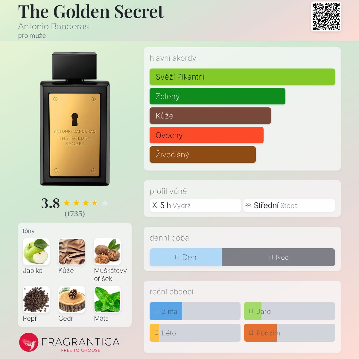 The Golden Secret podle Antonio Banderas je Aromatic Spicy vůně pro muže. The Golden Secret byl/a uveden/a v roce 2011. "Nosem" za touto vůní je Christophe Raynaud. Vrchní tóny jsou Jablko, Máta a Zelené tóny; střední tóny jsouMuškátový oříšek, Pepř a Kmín ; základní tóny jsou Kůže, Cedr a Pižmo.
